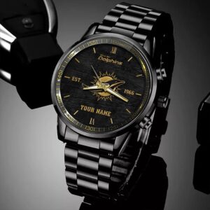 This stylish timepiece is unique, made with precision, and is the perfect accessory for any true Miami Dolphins supporter. The sleek black design paired with the bold Miami Dolphins emblem makes it a standout piece that showcases your team pride with elegance and edge.